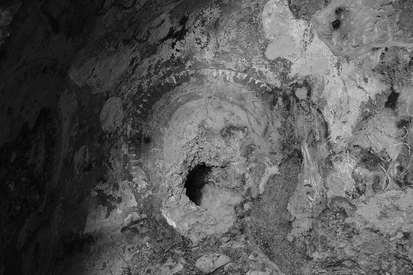 Inside the small Buddhist temples next to the Buddhas in the cliff face, any ancient paintings depicting human faces have either been shot at or destroyed using tools. Much of this damage was from 2001. Above is a painting of what was Buddha’s face on the walls.